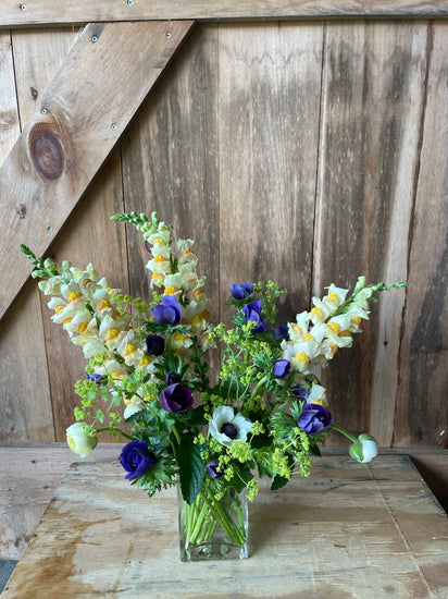 Carefully designed, local Maine Snapdargon flowers, Lady's mantle and Purple Anemones in a vase!